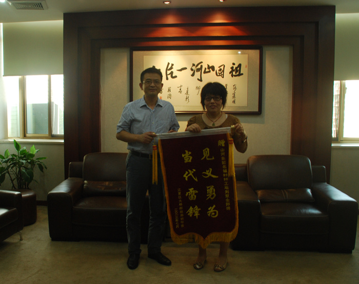 图为集团公司副总经理兼湖北公司总经理林中茂(左)接受郭琴香(右)赠送的锦旗