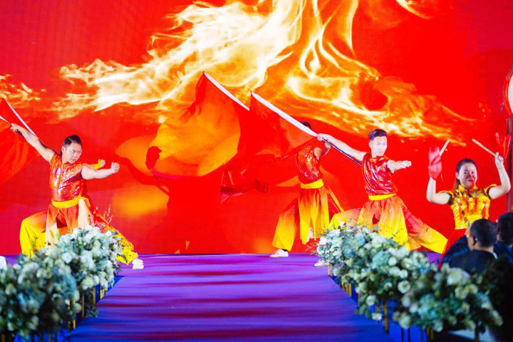 在锣鼓喧天中,一面面红旗接踵而至,宛如祖国山河建设崛地而起,开场舞《旗开得胜》拉开了年会的序幕,预示着新的一年旗开得胜,马到成功。