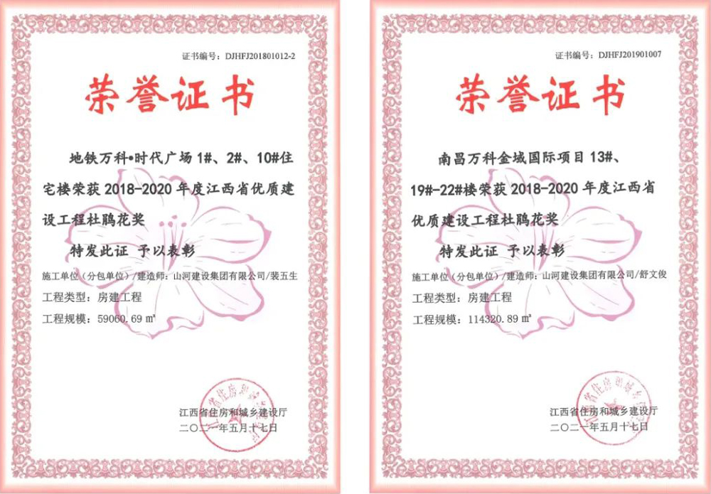 近日,江西省住房和城乡建设厅发布《关于表彰2018-2020年度江西省优质建设工程奖获奖工程的通报》,山河建设集团江西公司承建的地铁万科·时代广场、万科金域国际项目双双获得江西省优质建设工程杜鹃花奖。