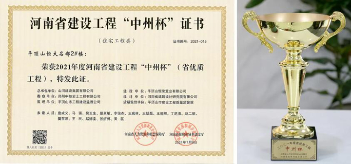 近日,河南省人力资源和社会保障厅、河南省住房和城乡建设厅共同颁发“2021年度河南省建设工程中州杯(省优质工程)奖”,山河建设集团河南公司承建的平顶山恒大名都2#楼喜获“中州杯”荣誉。这是河南省建设工程质量最高奖,代表着全省工程建设质量的最高水平。